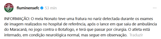 Conforme informado pelo Tricolor, ele passará a noite internado em um hospital na Zona Norte do Rio de Janeiro. Por meio de uma nota oficial, o Flu detalhou o caso; confira: