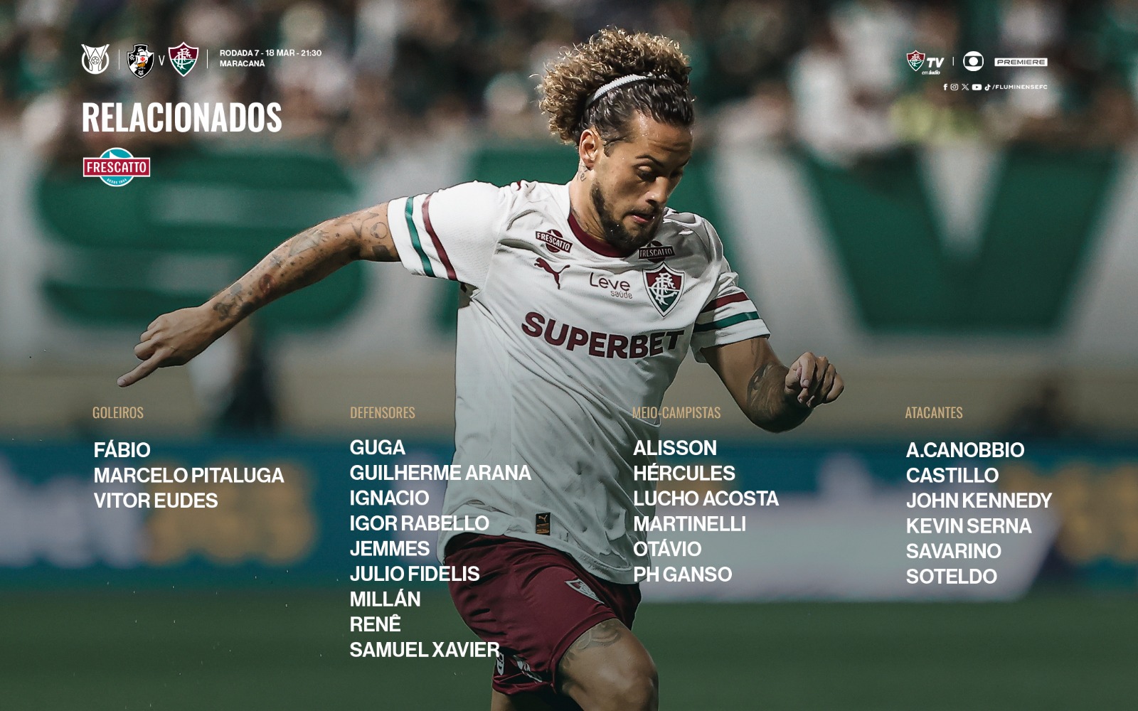 O Fluminense divulgou na tarde desta quarta-feira (18) a lista de relacionados para o clássico contra o Vasco, que acontece logo mais, às 21h30, no Maracanã.
