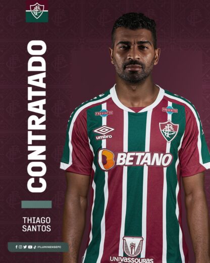 Destaque Futebol Masculino Notícias Uncategorized Fluminense anuncia oficialmente a contratação de Thiago Santos 31/03/2023 Pedro Ribeiro Fluminense, Thiago Santos CompartilheO Fluminense anunciou a contratação de Thiago Santos. O volante chega ao clube após rescindir com o Grêmio. O atleta assinou com o tricolor carioca até o final de 2024. Foto: Divulgação / Fluminense FC Compartilhe