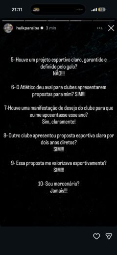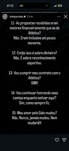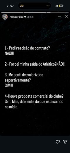 Em meio a uma novela sobre uma possível transferência de Hulk para o Fluminense, o atacante do Atlético-MG fez uma postagem em seu Instagram negando a noticia que o próprio havia pedido uma rescisão no Galo e afirmando que irá cumprir o seu contrato com o clube. O camisa 7 também afirmou que recebeu uma proposta de outro clube por um contrato de dois anos, mas com uma remuneração menor que a atual.