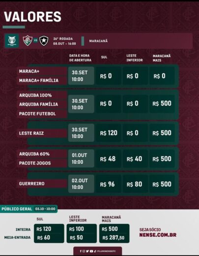 O Fluminense divulgou a informações de ingressos para a partida contra o Botafogo, válida pela 26ª rodada do Campeonato Brasileiro, que acontece no próximo domingo (07/10), às 16h, no Maracanã.