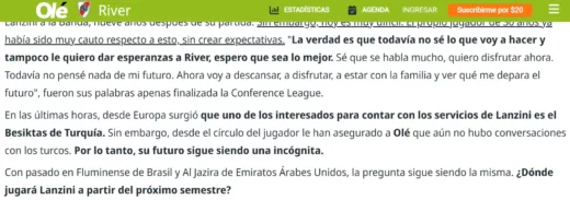 A reportagem do Jornal Olé, da Argentina, falou sobre o casamento do atleta e sobre o futuro do jogador. Existe muita expectativa dos torcedores do River para o retorno do meia ao clube. No fim da matéria, o Jornal mencionou o Fluminense como ex-clube de Lanzini.