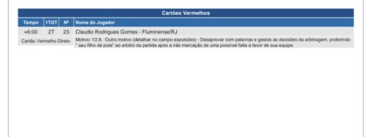 “Claudio Rodrigues Gomes – Fluminense/RJ – Cartão Vermelho Direto – Motivo: Desaprovar com palavras e gestos as decisões da arbitragem, proferindo “seu filho da puta” ao árbitro da partida após a não marcação de uma possível falta a favor de sua equipe”.