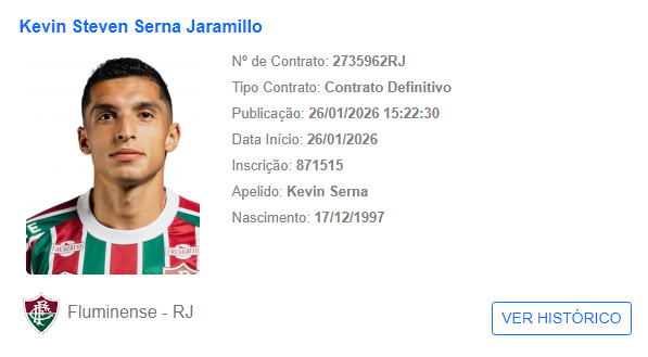 Ler maisO Fluminense oficializou a renovação de contrato do atacante Kevin Serna, com publicação do novo vínculo no Boletim Informativo Diário